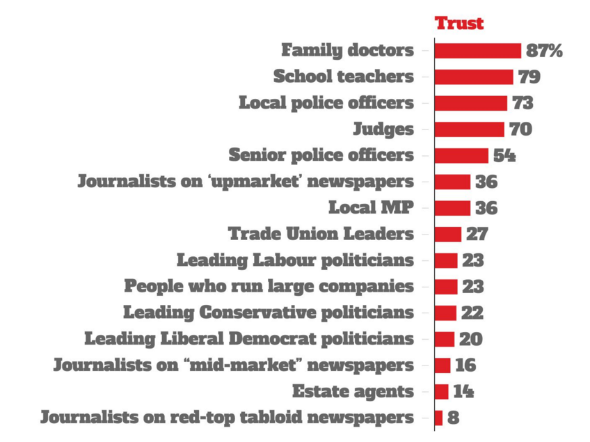 Looking at the position over a 12-year period since 2003, those professions whose confidence rating fell included Lib Dem politicians (down 16%), senior police officers (down 18%) and journalists (upmarket ones fell by more than mid-market ones, 29% compared to 20%, but after the hacking scandal it is not surprising that red-top tabloid journalists still managed a fall, from an already low 14% to just 8%, the least trusted professional of all now). Meanwhile estate agents fell by only 2%, from 16% to 14%.