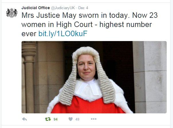 According to the Judiciary Tweetsperson, with the appointment of Her Honour Judge Juliet Mary May QC to the Queen’s Bench Division, there are now more women High Court judges than ever before – 23 to be precise, out of a total of, er… well, let’s see now: the Judiciary website has a current list of the Senior Judiciary. This shows the following numbers.
