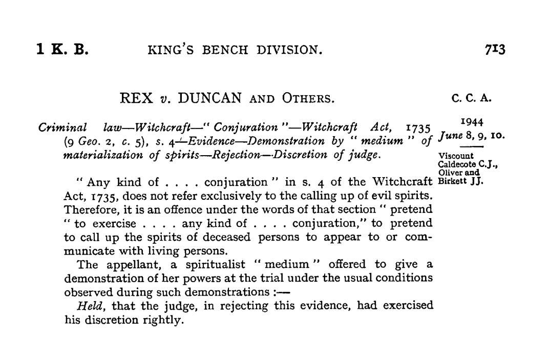 Her conviction was upheld by the Court of Appeal in R v Duncan [1944] KB 713, which confirmed that the 1735 Act’s language extended to any fraudulent claims of spirit communication, regardless of whether the spirits invoked were “evil” or benign.