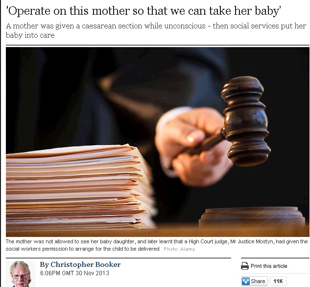 The story seems to have first broken with an article by Christopher Booker in the Saturday Telegraph of 30 November 2013, under the headline “Operate on this mother so that we can take her baby.” (“A mother was given a caesarean section while unconscious – then social services put her baby into care” it began.) The story was taken up by other newspapers the following day (1 December), eg The Independent with its headline “Forced c-section was ‘the stuff of nightmares’: Social Services condemned for forcibly removing unborn child from woman.”