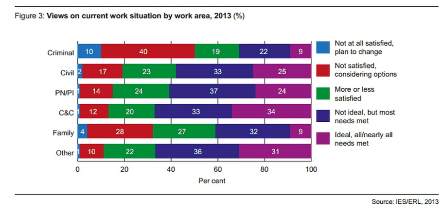 At the other end of the scale, as the above table shows, those working in the commercial and chancery area (predominantly Oxbridge educated, as it happens) reported higher levels of satisfaction with their lot, with 50% reporting increased earnings (19% substantially), and 34% viewing their current situation as “ideal, all/nearly all needs met” (compared to only 9% of the criminal bar).