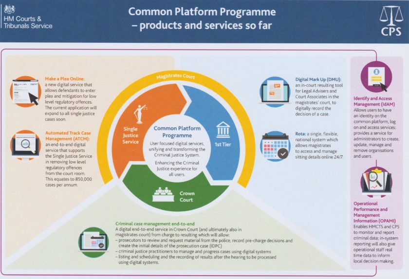 The Criminal Justice System (CJS) Common Platform is an in-house HMCTS development, so there are no immediate plans for it to incorporate the DCS (which is also available in a version adapted for family court hearings), though I was told it will eventually duplicate many of its features. The common platform is designed to replace existing case management systems with a single end-to-end system providing access to all the material necessary to deal with cases without having to pass material from one agency to another, covering the police, CPS, courts and prison service. This will hold the latest, most complete version of the case material and can be accessed by everyone who needs to, from almost anywhere, at any time.