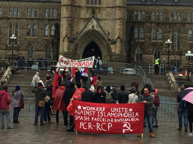 Outside the Parliament building there is now a small protest (anti-Sharia) and a slightly larger counter-protest (anti-Islamophobia) both somewhat dampened by the rain. The police look on, calmly. This year is the 35th anniversary of the Charter of Rights and Freedoms, including freedoms of assembly and of expression. The Charter is a fundamental part of the 1982 repatriation of the Constitution.