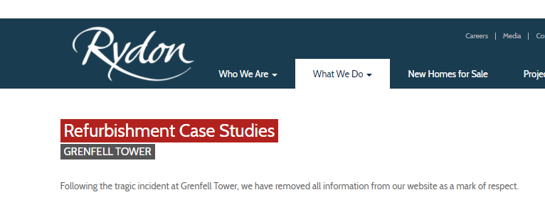 Meanwhile Rydon, the company that actually did the refurbishment of Grenfell Tower using the cladding in question, has “as a mark of respect” removed all information on the project from its website.