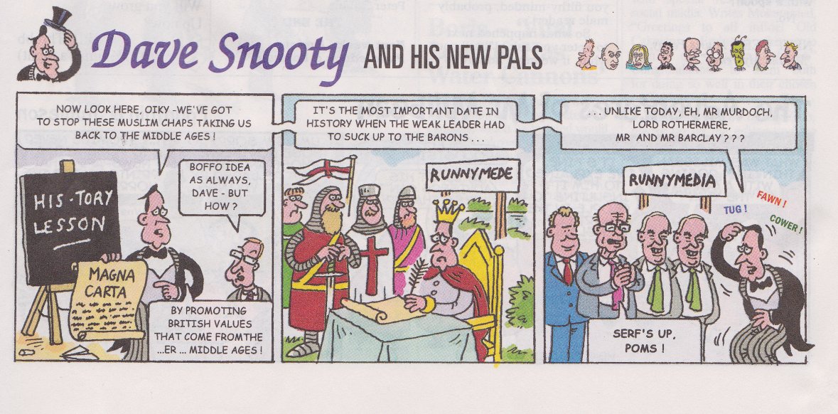 There’s been quite a bit of what people are calling “Magna Carta balls” in a Private Eye-ish sort of way. This involves yoking the 13th century charter in some rather bogus sense to a current news story or political point. Typical of the genre is this story, MPs call for anniversary debate on ‘new Magna Carta‘ which concerns calls for a new, written constitution. No doubt there are other examples. To mark the phenomenon, here is a cartoon demonstrating a certain kind of political wishful thinking, taken from, er, Private Eye (with grateful apologies).