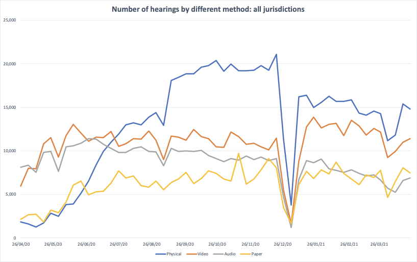 What the figures show is perhaps not surprising: that in the early part of the pandemic, one the first lockdown was imposed in March 2020, physical hearings in the courts all but dried up, with the vast majority of such hearings (far fewer than normally) being conducted by audio or video means, or else on the papers. As the state of emergency continued, while lockdowns eased or tightened, the number of hearings steadily increased, though the imposition of the third lockdown at the turn of the year reduced the volume of business.