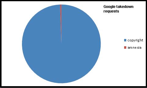 But the point needs to be reiterated, that these takedowns, such as they are, are but a drop in the ocean compared to the number Google acts on in respect of commercial considerations, like breach of copyright, or from governments or in pursuit of court orders. In the last month, Google reports that there were 29,074,809 URL removal requests on grounds of copyright alone. If you compare that to the total number of RTBF or “amnesia” requests (over several months), the pie chart looks like this: