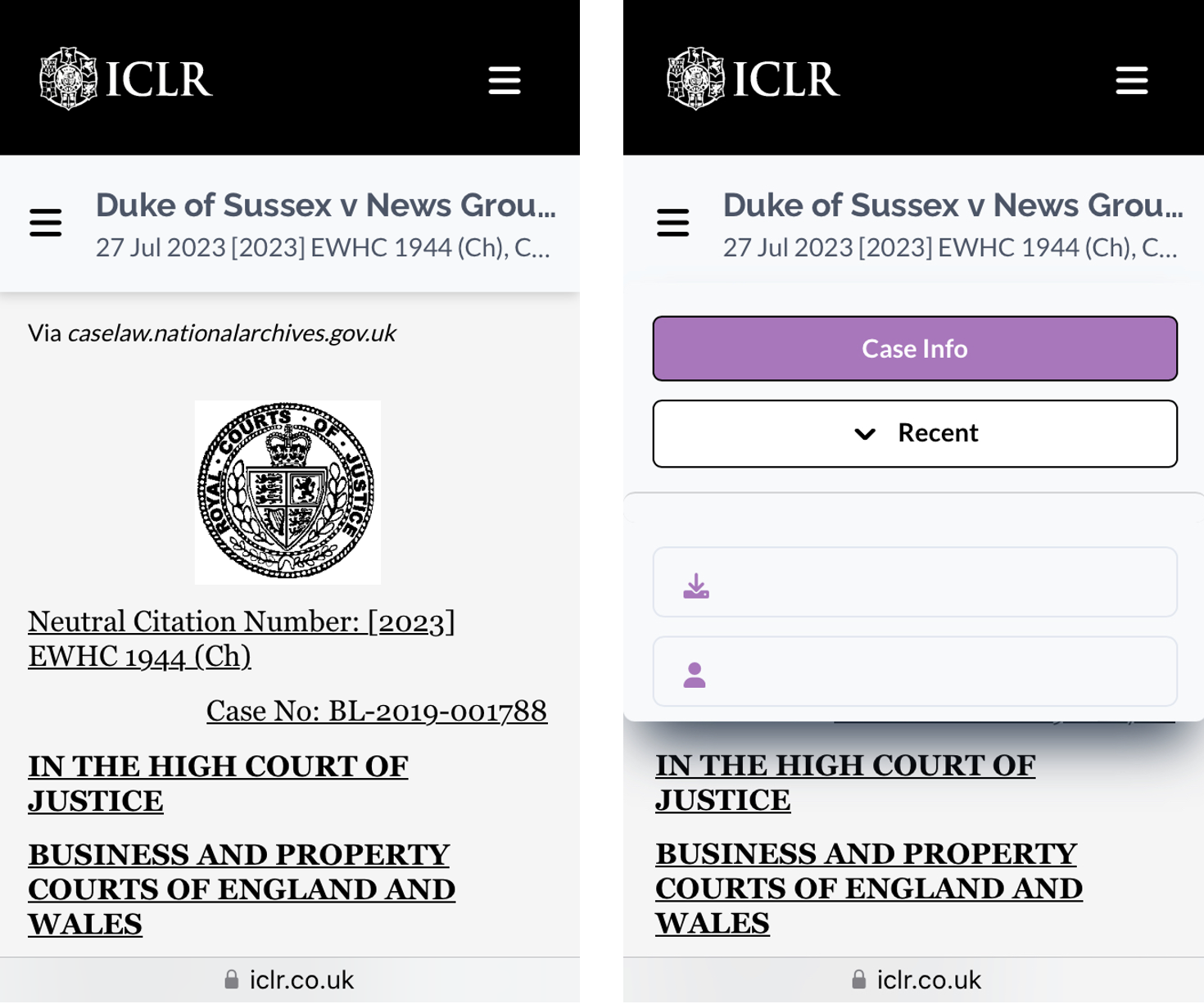 Some buttons, commands or drop-down elements have been moved to make it easier to operate them on a smaller screen. So, for example, when viewing a case report or transcript on a large screen, the buttons for “Case Info” (showing index information about the case) and “Recent” (a dropdown showing previously viewed cases) have been moved to the right of the case name, next to the PDF download button. This gives greater space for longer case names: