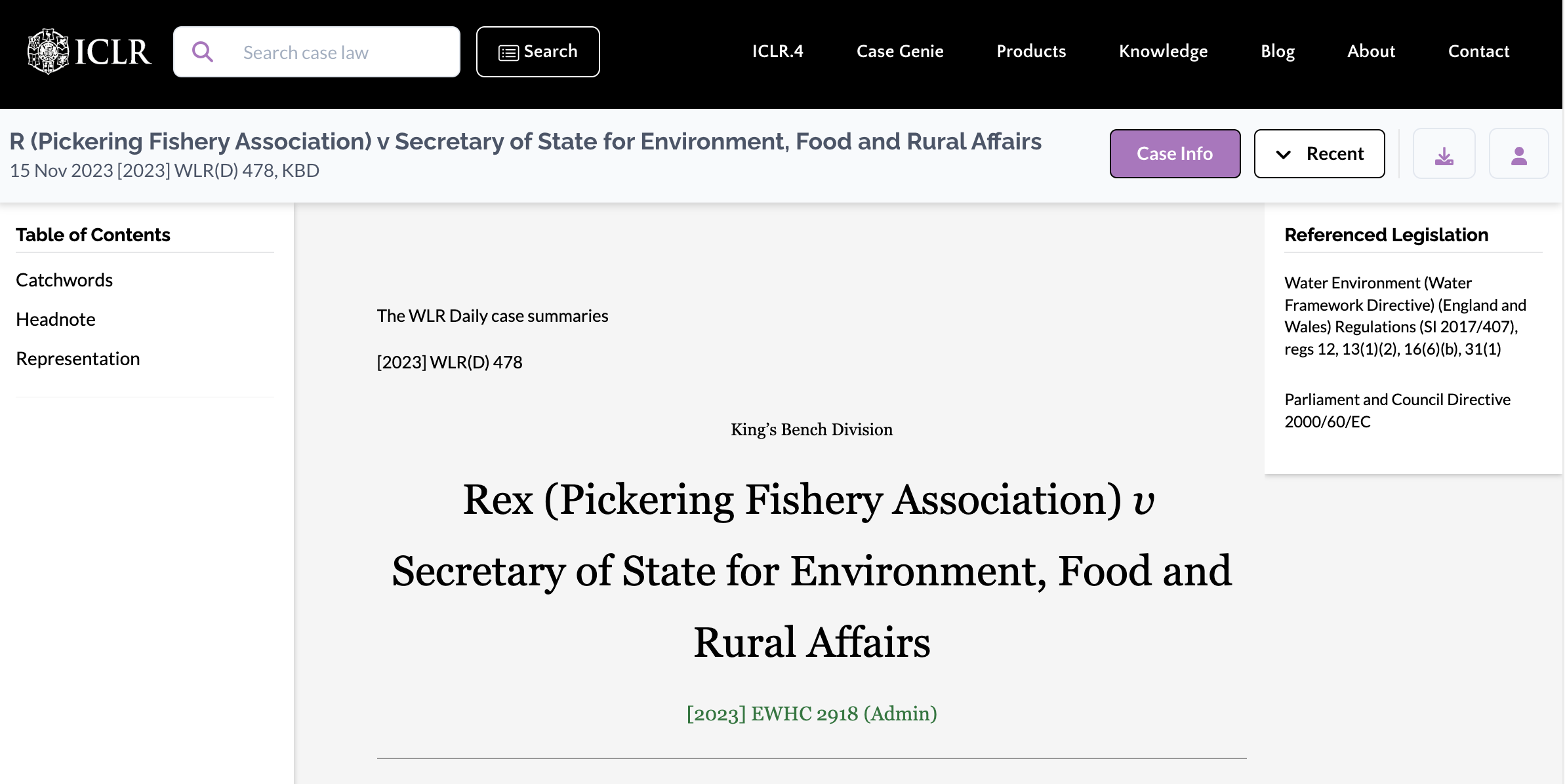 UK Human Rights Blog: Defra’s generic plan for river clean up unlawful — local focus on water bodies needed: R (Pickering Fishery Association) v Secretary of State for Environment, Food and Rural Affairs [2023] EWHC 2918 (Admin); [2023] WLR(D) 478, KBD