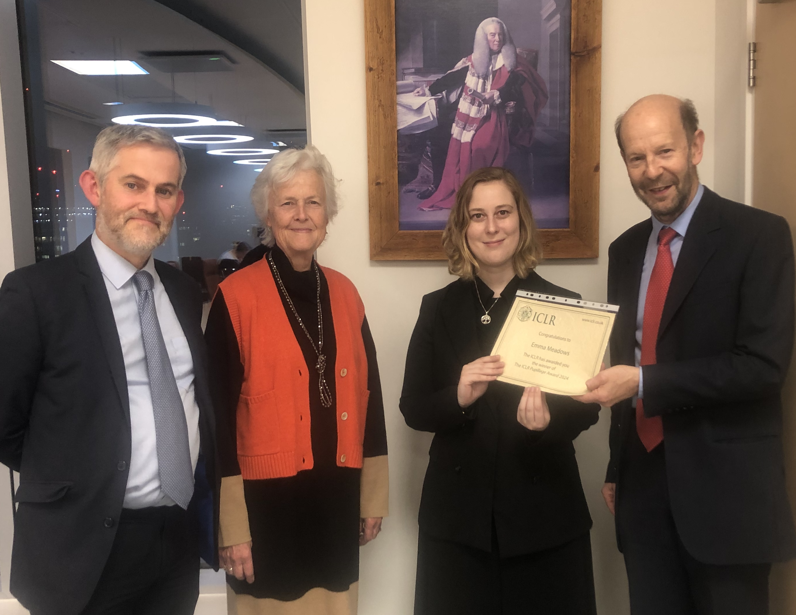Congratulations to barrister Emma Meadows, winner of the 2024 ICLR Pupillage Award, seen here receiving her certificate from the award judges, Mr Justice Roth, Acting President of the Competition Appeal Tribunal (where the award reception was held), Margaret Bowron KC, of 1 Crown Office Row, and Brendan Wright, barrister, Editor of The Law Reports.