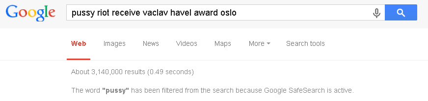 Incidentally, when searching for this story on google, I included the word “pussy riot” and was told some results had been filtered out for the word “pussy” because Safe Search was on. This seems a tad, well, prissy. Another example of google going over the top to semaphore its compliance with tiresome regulation?