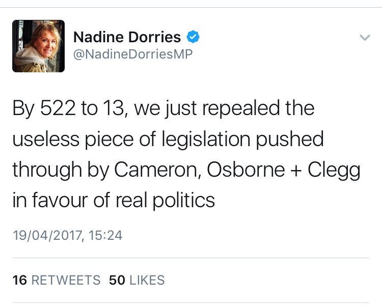 One MP seemed to think so. Nadine Dorries MP appeared to suggest that, by passing a motion (unfortunate wording perhaps) in accordance with the terms of the Act, Parliament had actually repealed it. She tweeted as follows: