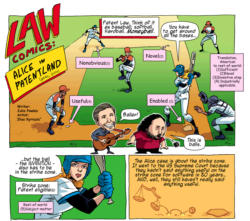 Julia Powles is a PhD student in Cambridge (Laws) but is also the creator of Law Comics (with assistance from illustrator Ilias Kyriazis). The first instalment focuses on patent law and is titled: Alice in Patent Land. The comic strip is reproduced in full on Patently-O, but this taster gives some idea of its energetic flair. Reproduced with Julia’s kind permission.