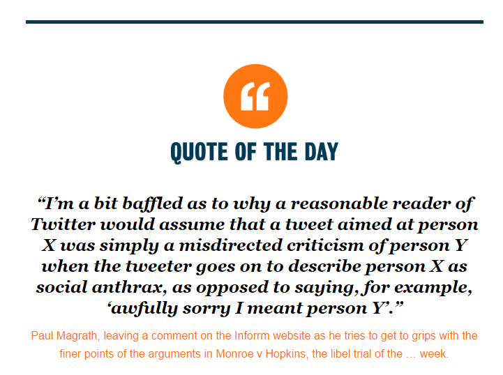 The judge appointed to head up this new section is Mr Justice Warby, formerly of 5RB media law chambers, who has also been in the news this week as the judge hearing the high profile Twitter libel case of Monroe v Hopkins, a preview of which was helpfully (and apparently very popularly) supplied by Inforrm’s blog, along with daily reports.