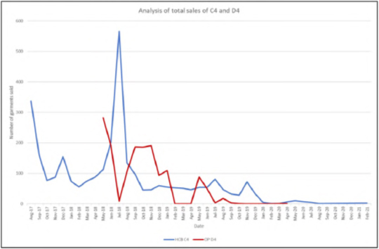 27. During Dr Branney's cross-examination, it emerged that sales of many of the 66 garments referred to in the Defence, the Amended Defence and the Amended Defence to the Points of Claim had not in fact ceased, but rather, after a brief hiatus, had commenced again. Of the garments still relevant in these proceedings, only sales of D41 had in fact ceased by January 2019 and not recommenced. Sales of D54 and D57 had ceased some time earlier at the end of their sales cycle.