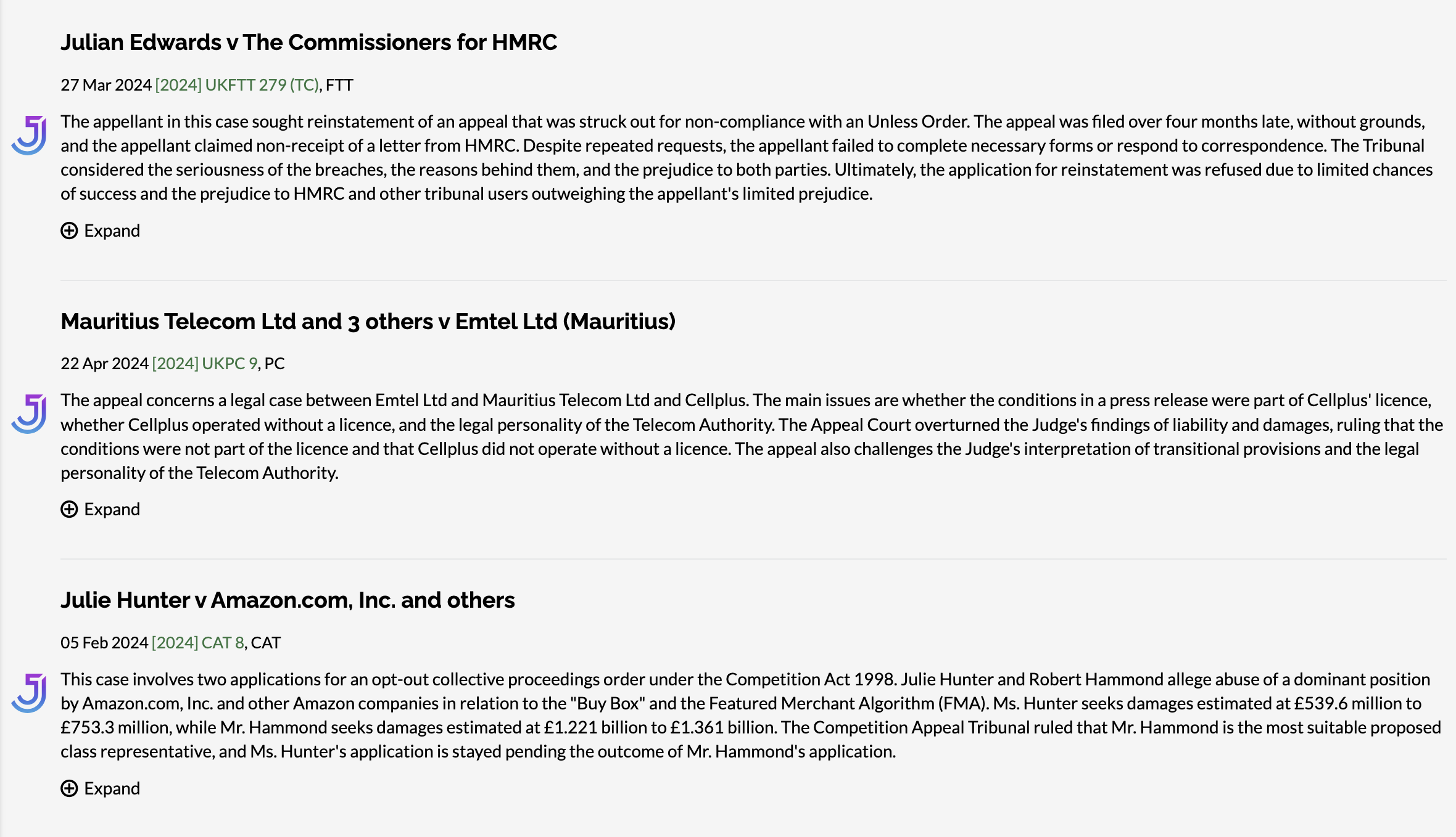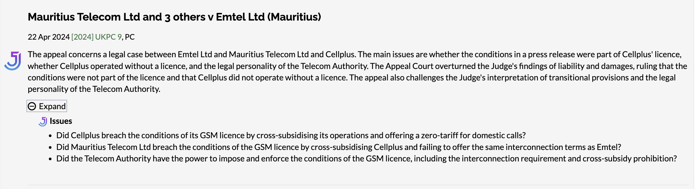 Once the 100 word summary has been added to a new case by Jurisage, it will appear in the list of results following the case hearing details, indicated by the Jurisage icon.